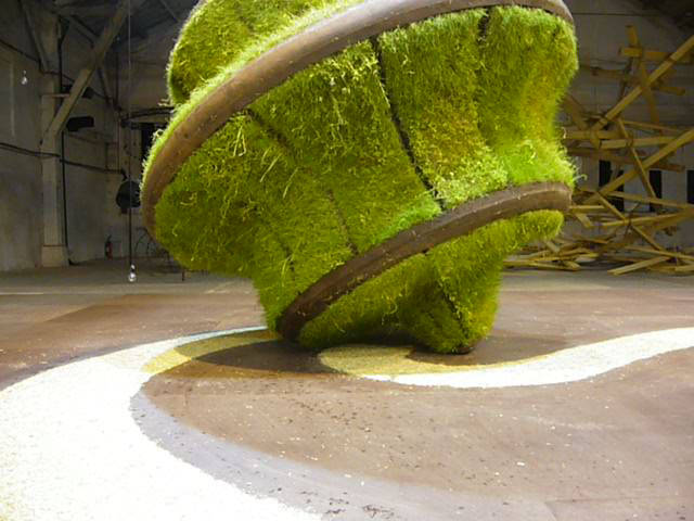 Telle la Terre originelle, La Motte est une planète végétale futuriste de 2,5 m de diàmètre, hérissée d’arêtes et en révolution perpétuelle. Le monstre est mue par des forces et énergies gravitationnelles qui perturbent sans cesse son inéluctable trajectoire. Parfois, elle hésite, semble subir le mouvement imposé, tangue, reste un temps en suspens puis repart vers sa destinée, imprimant de son poids la trace au sol de son passage pour faire surgir le dessin de son écriture lente et singulière. Ce phénomène à la temporalité étirée requiert une attitude méditative. Défi ou résistance à la vitesse ? Regardable en tous points, rétive à l’analyse, elle ouvre des perspectives infinies à nos imaginaires poético-politiques.